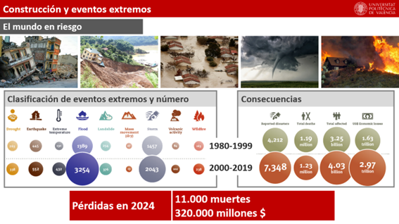 Figura.- Diapositiva expuesta durante el pasado Foro Técnico ANDECE, donde se ilustraba el incremento significativo de eventos climatológicos extremos y sus consecuencias en cuanto a daños humanos y materiales [2]